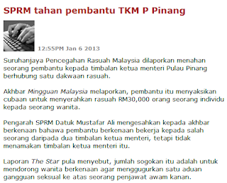 Malaysiakini (yang menerbitkan berita pada pukul 12:55) memetik Mingguan Malaysia menyebut SPRM menahan seorang pembantu kepada timbalan ketua menteri Pulau Pinang berhubung satu dakwaan rasuah.